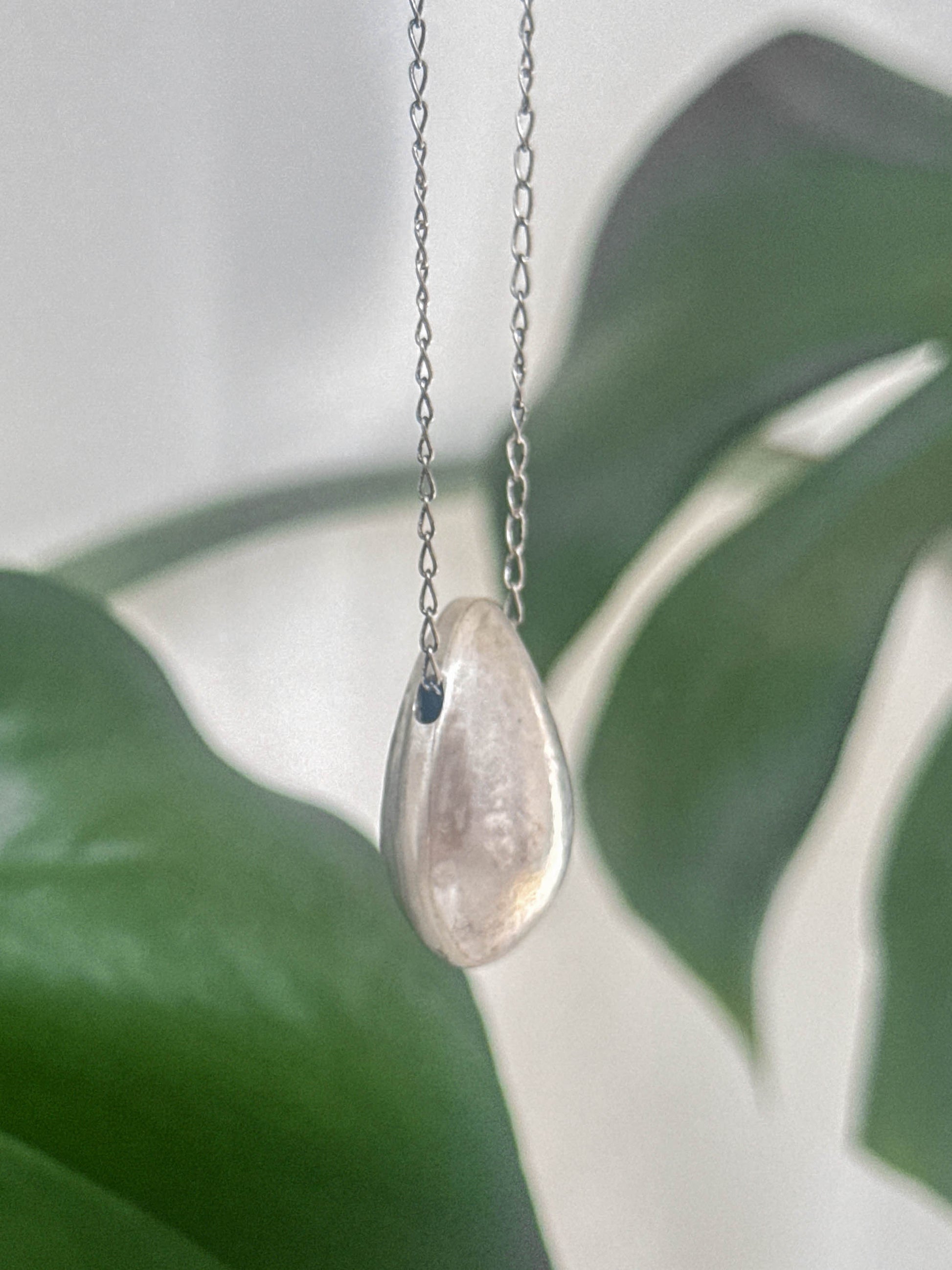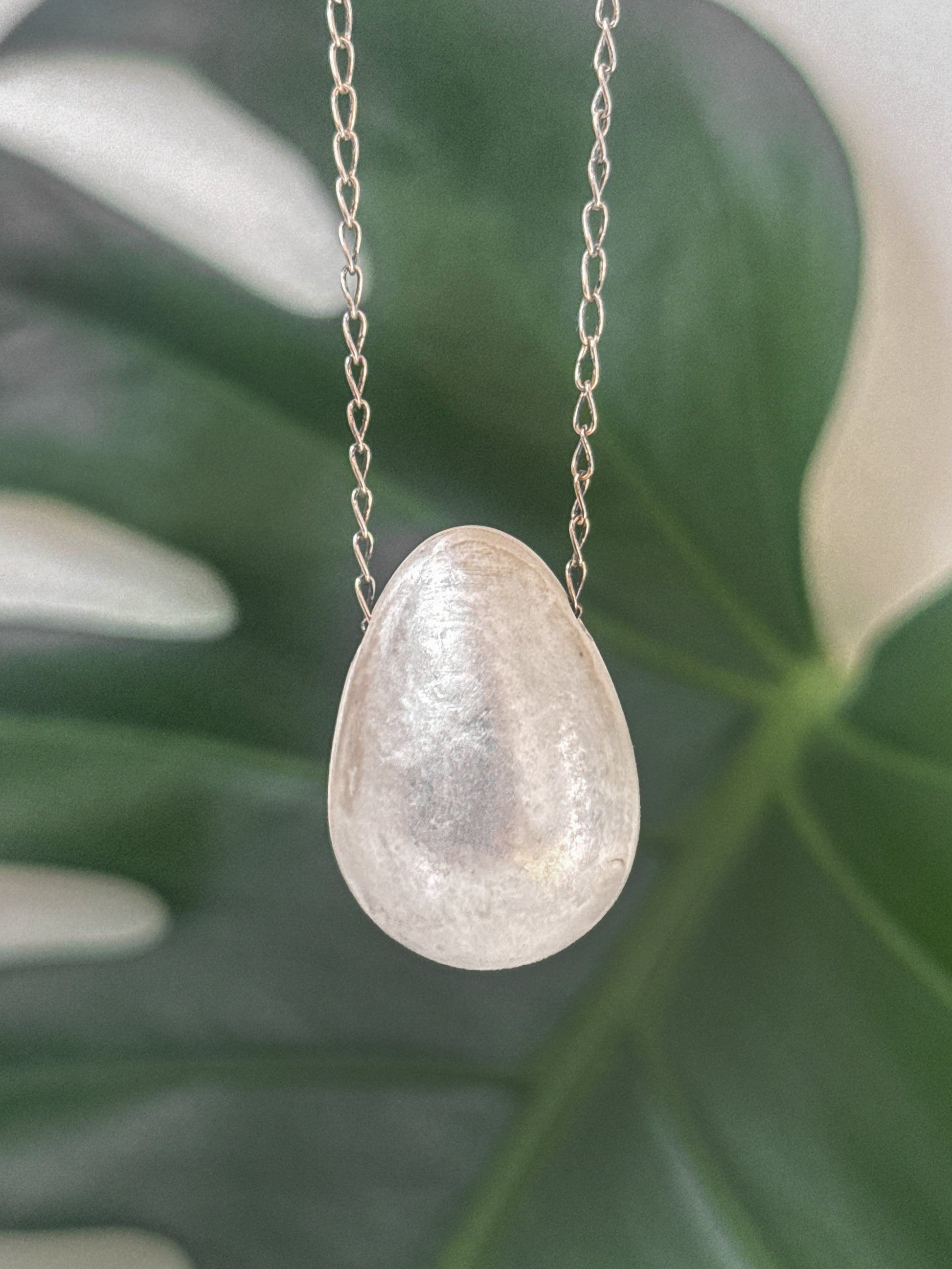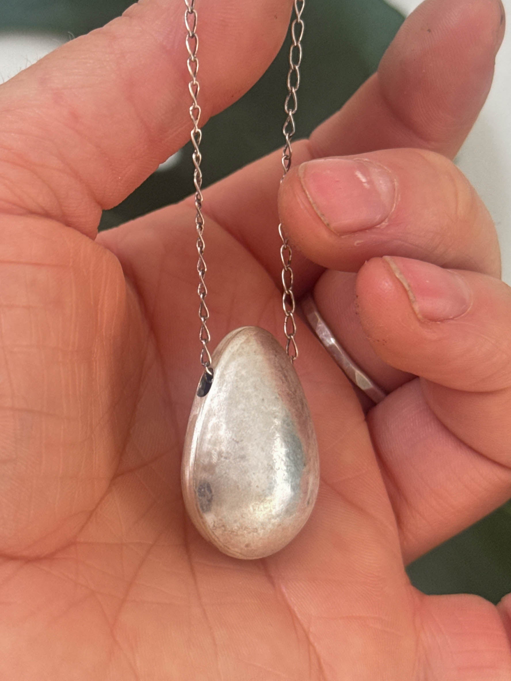 Hollow fabricated sterling silver egg pendant on continuous 30" chain. With no clasp, this necklace just goes on over your head. The long chain makes it a great length for fidgeting and holding the pendant when worn.
